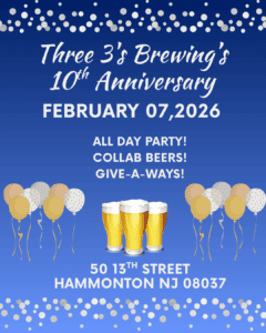 Hammonton: Diane from Three 3’s Brewing Company sent information about 10th Anniversary Celebration scheduled for Saturday, February 7 2026 from 12:00 pm to 10:00 pm. Diane says…