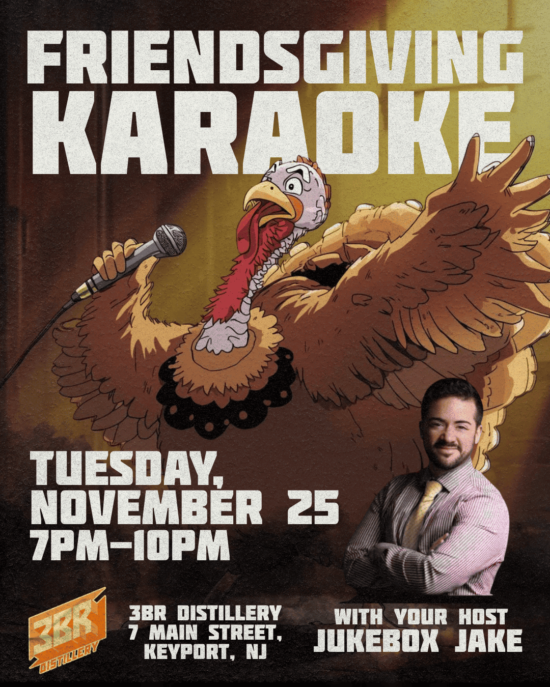 Keyport: Cassidy from 3BR Distillery sent information about Friendsgiving Karaoke! scheduled for Tuesday, November 25 2025 from 07:00 pm to 10:00 pm. Cassidy says…