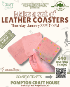 Pompton Lakes: John from Pompton Craft House sent information about Leather Coasters Workshop at Pompton Craft House scheduled for Thursday, January 22 2026 from 07:00 pm to 09:00 pm. John says…